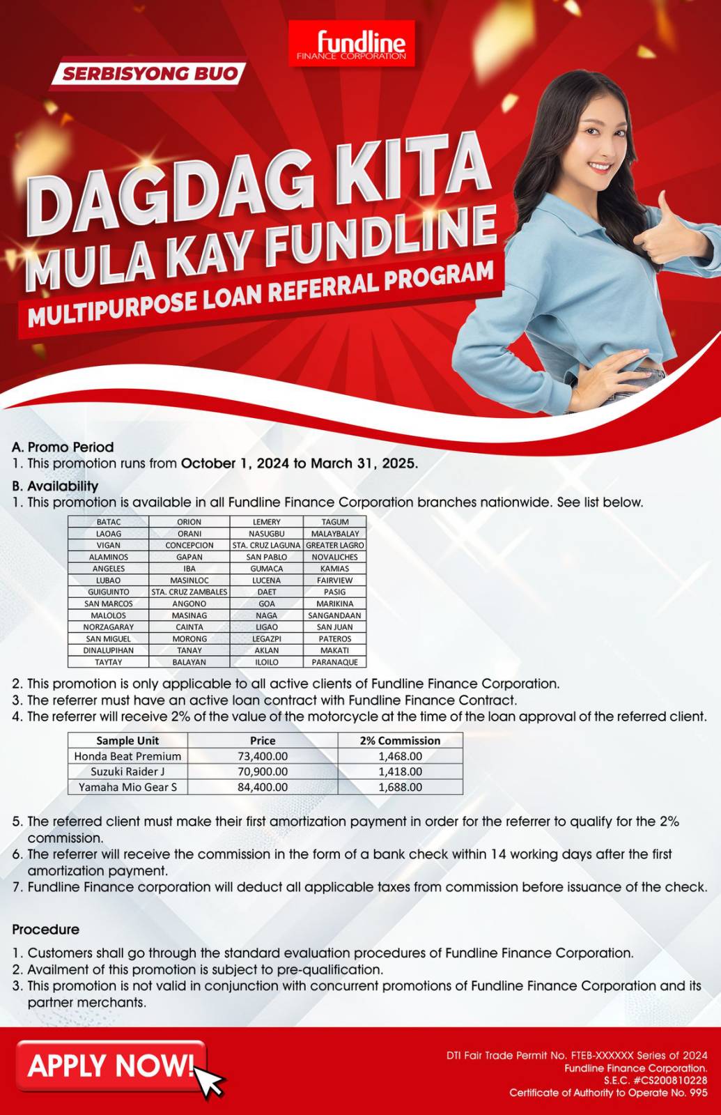 - This promotion is available in all Fundline Finance Corporation branches nationwide. See list below:
